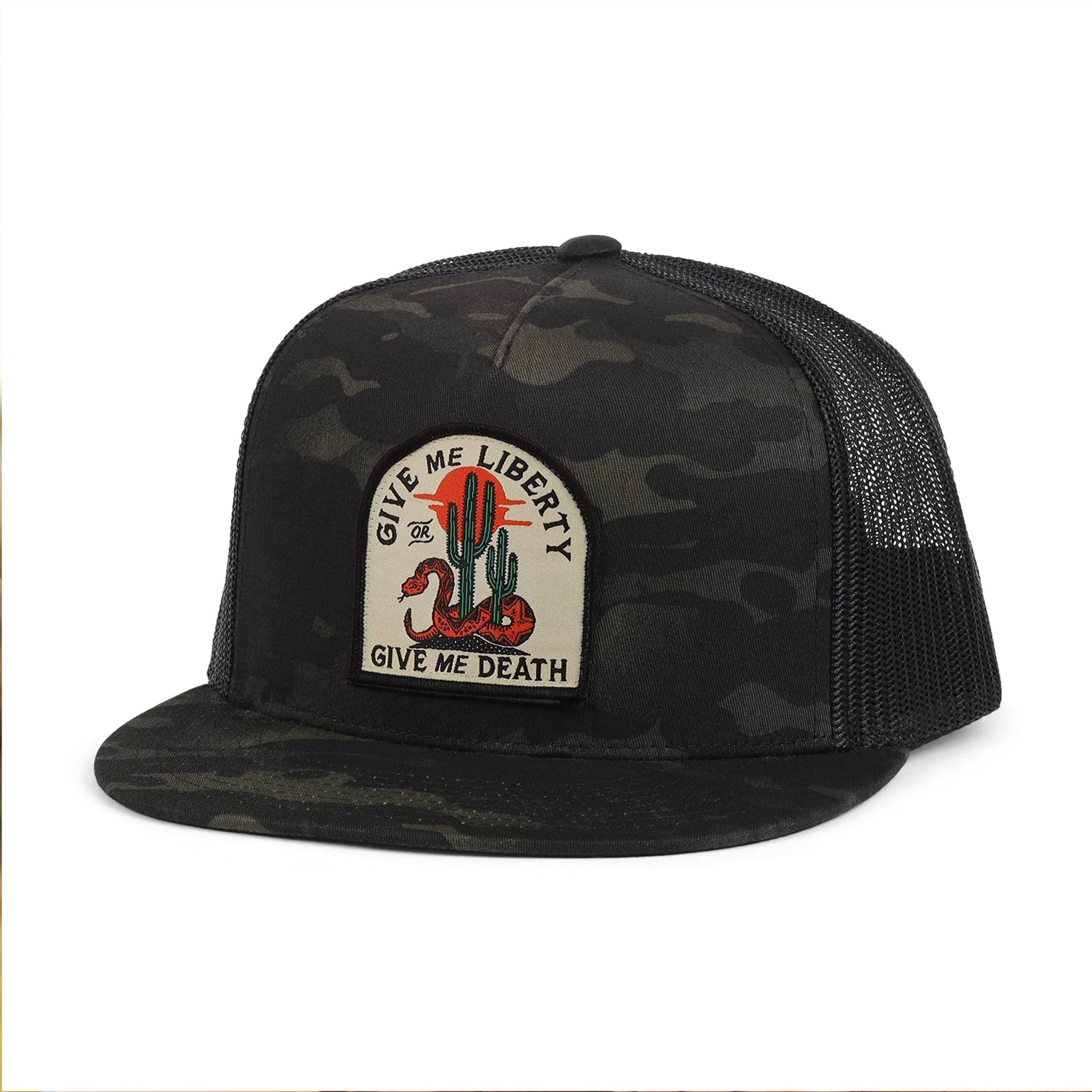 Live free or die trying. The Liberty or Death Black Camo Trucker Hat by The Brave Ones is a statement of resilience, freedom, and the wild frontier. Featuring an embroidered patch with a coiled rattlesnake, bold cactus, and the iconic words “Give Me Liberty or Give Me Death,” this rugged cap is built for outlaws, cowboys, and anyone who refuses to be tamed.